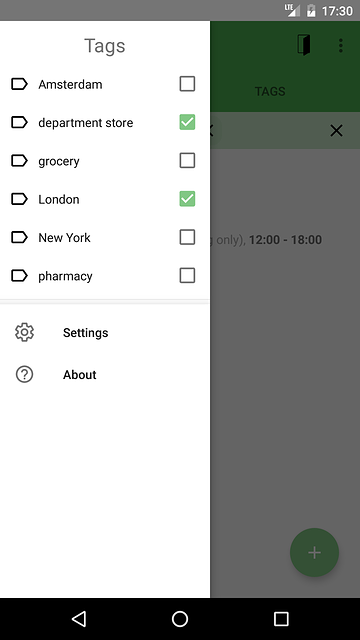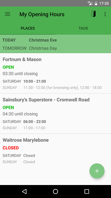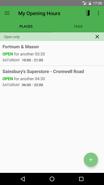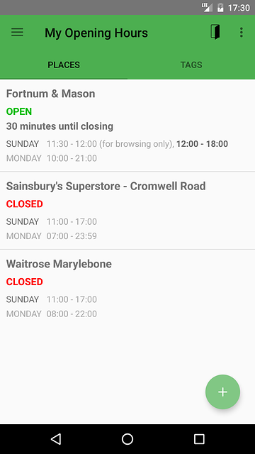 My Opening Hours allows you to maintain a list of places and their opening hours. With one glance you can see whether it's open or not and the time until opening or closing. Tags can be used to mark your places and then quickly find them. My Opening Hours requires Android version 4.1 or newer.
