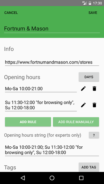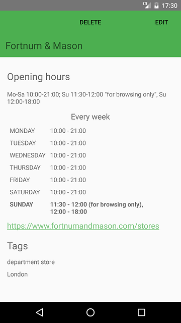 - OpenStreetMap support - retrieving and sharing opening hours using this collaborative map service